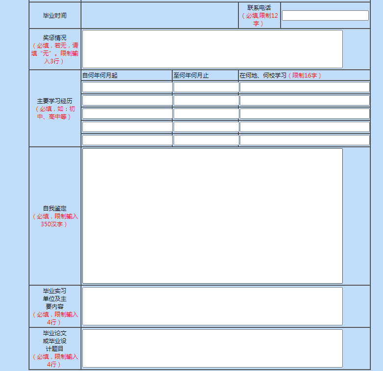 ①学生登录平台后,必须填写以下六项:联系电话、奖惩情况、主要学习经历、自我鉴定、毕业实习单位及主要内容和毕业论文或毕业设计题目。